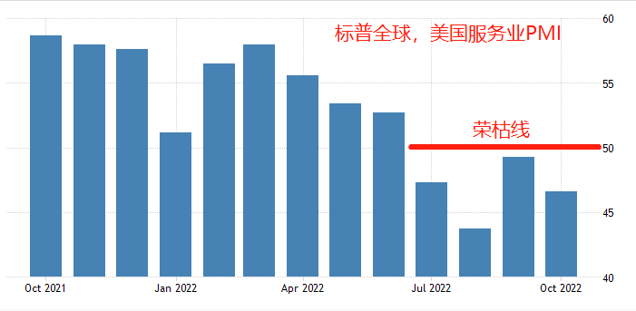 美国的软/硬件科技、医疗保健和金融行业一直被市场看重,属于传统的热门板块,三者各自总市值在2万亿至8万亿之间。虽然科技板块存在诸如苹果、特斯拉这样的制造型科技企业,但三大板块主要的业务倾向仍为服务业。据标普全球数据,10月美国服务业I最新值46.6,低于前值49.3,也低于50的荣枯线,这种不利局面已持续四个