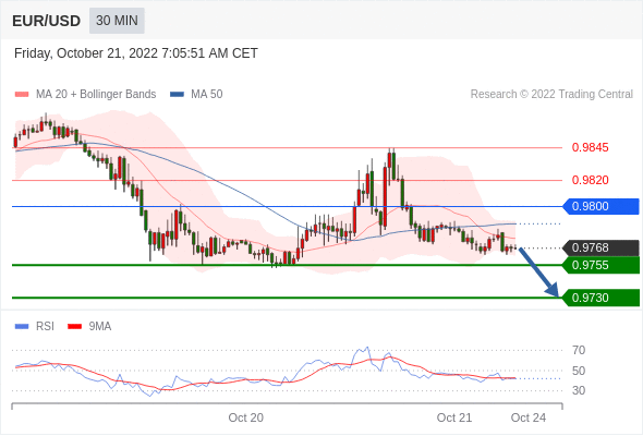 上周五汇市大幅波动引发欧元买盘。美元指数下跌,原因是投资者对激进货币紧缩的押注有所回落。此前《华尔街日报》发表一篇报道称,一些美联储官员担心大幅加息会导致过度紧缩。继经历上周五波动之后,欧元已经脱离中期波动趋势的看跌范围,未来数日欧元/美元有望接近0.99,如下图所示。 趋势线阻力位阻止汇价实现突破