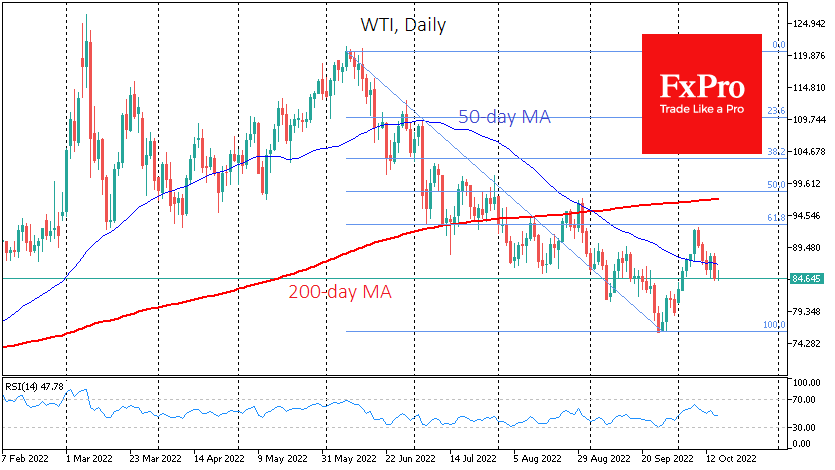 三周前,由于OC+减产,油价开始了22%的上涨,并在技术上超卖之后反弹。然而,上周8%的跌幅表明空头仍然主导着这个市场,几个技术因素可以看出这一点。 在周线图上,WTI原油从其50周移动均线大幅下降,清楚地表明中期下行趋势正在盛行。 Fxro高级分析师Alx?Kutikvich指出:在日线图上,油价反弹完全符合传统