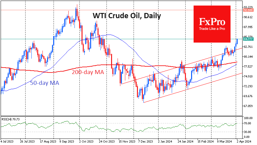 油价已经达到了5个月来的高点,自3月27日以来,每个交易日都在上涨。周二开盘,WTI的每桶价格达到84.6美元,欧洲股市午盘小幅回落。 Fxro高级分析师AlxKutikvich指出:在某种程度上,石油正在设法效仿黄金。自上周初以来,黄金的买盘也在稳步增加。最近的涨势也可以归因于中国经济加速的迹象,以及美国持续强劲