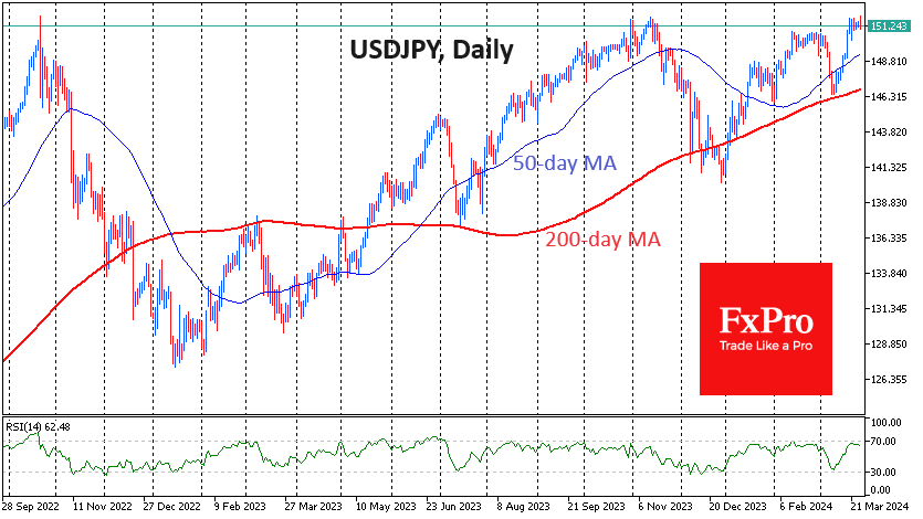日本央行3月初收紧货币政策的逆转不仅未能扭转局面,而且还加剧了日元的疲软趋势。鉴。鉴于美联储和欧洲央行距离普遍预期的降息只有不到三个月的时间,日元面临的系统性压力引发了更多问题。 Fxro高级分析师AlxKutikvich指出:周三上午,美元兑日元升至151.97,比2022年11月的高点高出7个点,比2022年10月的高点