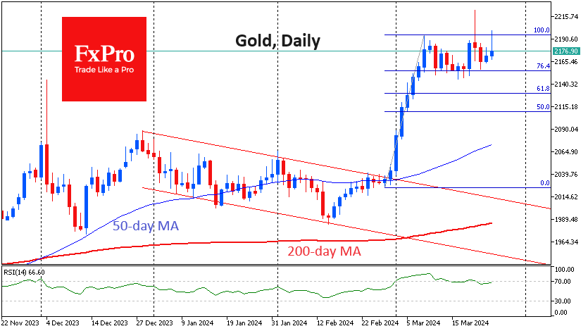 周二,黄金价格在历史上第二次突破2200美元大关,但在美国股市早盘回落至2182美元。如今,加密货币的交易方向与黄金相同,但银、铂和铜却未能取得类似的收益,这引发了一些不安。 Fxro高级分析师AlxKutikvich指出:金价突破2195美元,测试了2月底至3月8日的反弹高点。高于这一水平将是迈向新一轮上涨的第一步,