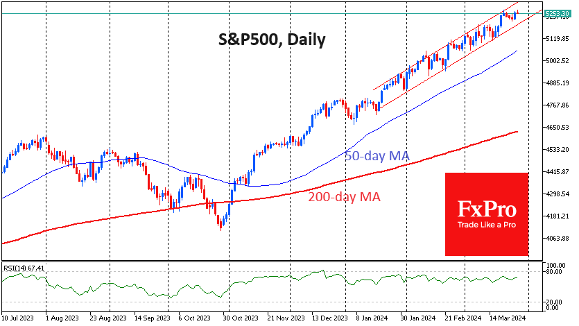 美国股市继续保持上涨趋势,标准普尔500指数第一季度上涨10.8%,超过了全年的历史平均涨幅。自1月底以来,该指数的低波动性更令我们印象深刻。 Fxro高级分析师AlxKutikvich指出:标准普尔500指数的波动幅度不到2.5%。市场频繁的小幅回调为进一步买入奠定了基矗这种类型的反弹在成熟的牛市中很常见,这些牛市已经