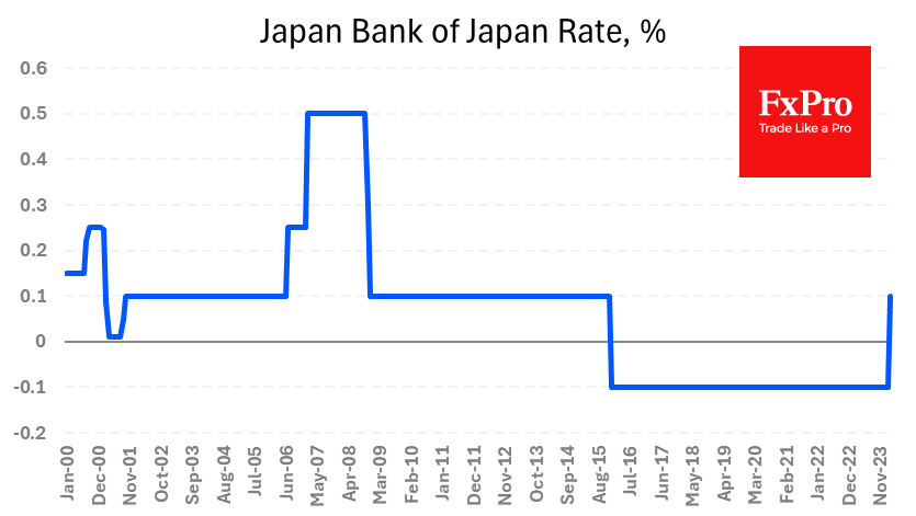 日本央行上调了其关键利率,成为世界上最后一家放弃其负利率政策的日本央行。 Fxro高级分析师AlxKutikvich指出:日本央行将利率从-0.1%提高至0.0%至0.1%。央行将在商业银行的资产负债表上收取0.1%的费用,这是它自2016年以来首次这样做。日本央行还拒绝进一步购买房地产TF和信托基金,并拒绝控制收益率曲线