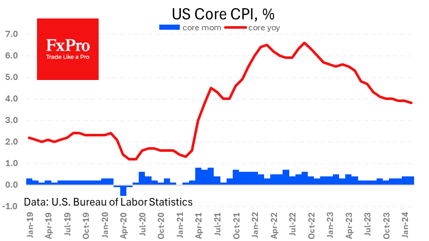 美国消费者通胀连续第四个月超过预期。消费者物价指数CI月环比上涨0.4%。自去年10月以来,月度增长率一直在上升。同比增长率攀升至3.2%,略高于预期的3.1%。 Fxro高级分析师AlxKutikvich指出:核心CI月率第二个月上升0.4%。年增长率降至3.8%,该指数正式进入下行空间。 然而,过去三个月,整体指数和