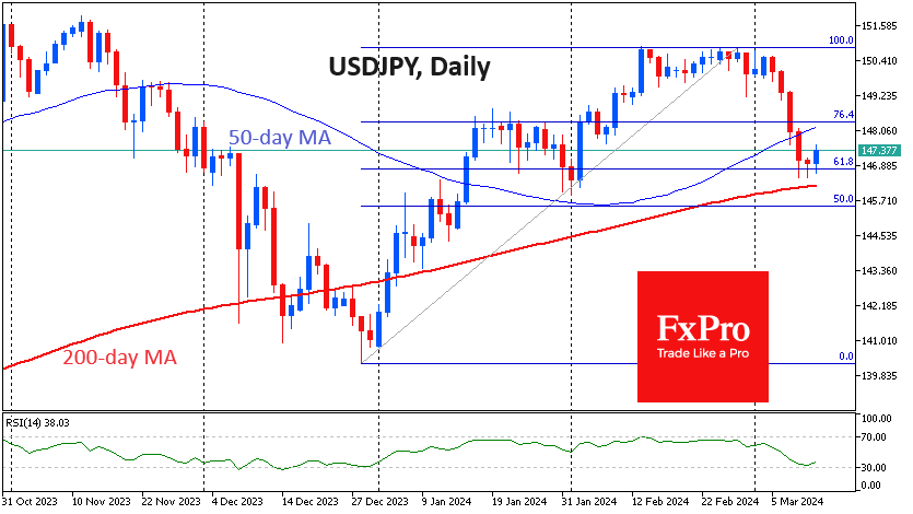 美元兑日元在五个交易日累计下跌2.5%之后开始反弹。在每日的时间框架内,该货币对在暂停之后的后续走势使我们能够确定进一步的中期趋势。 Fxro高级分析师AlxKutikvich指出:美元走软伴随着美元兑美元自上月底以来的下跌,但这也可以被视为从12月底的低点140.3至上月高点150.8的修正。该货币对的买盘位于61.8%的