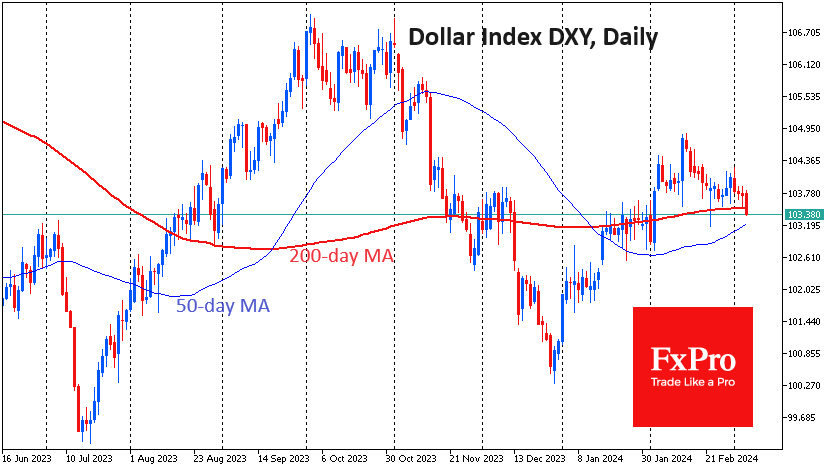 周在二月初,美元成功在一次急剧的走势中盘整在这条线以上,但这并没有让其像人们预期的那样呈增长趋势。在十一月和十二月,下一步举措将是降息的信号使美元下跌了近6%。美元只能够挽回一半的损失,因为对于首次降息的预期从三月被推迟到了六月,并且今年的降息次数也从六次减少到了三次。三,美元指数下跌了三个百分点