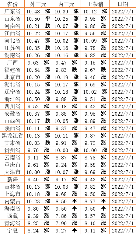 猪肉价格今日价(2022年7月1日) 备注:以上猪肉价格仅供参考,请以官方价格为准。