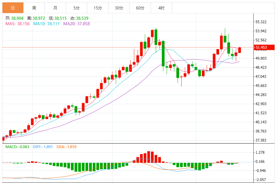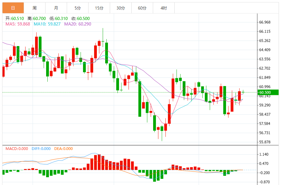 周三(11月19日),美原油价格交投于60.490美元/桶附近,跌幅为0.28%。 原油价格在最后一个交易日小幅下跌,这似乎是继之前上涨后的获利回吐,此前原油价格触及60.25美元的关键阻力,这是短期内横盘交易区间的顶部。 价格目前正在看涨修正波内移动,利用因其在A50上方稳定而形成的动态支