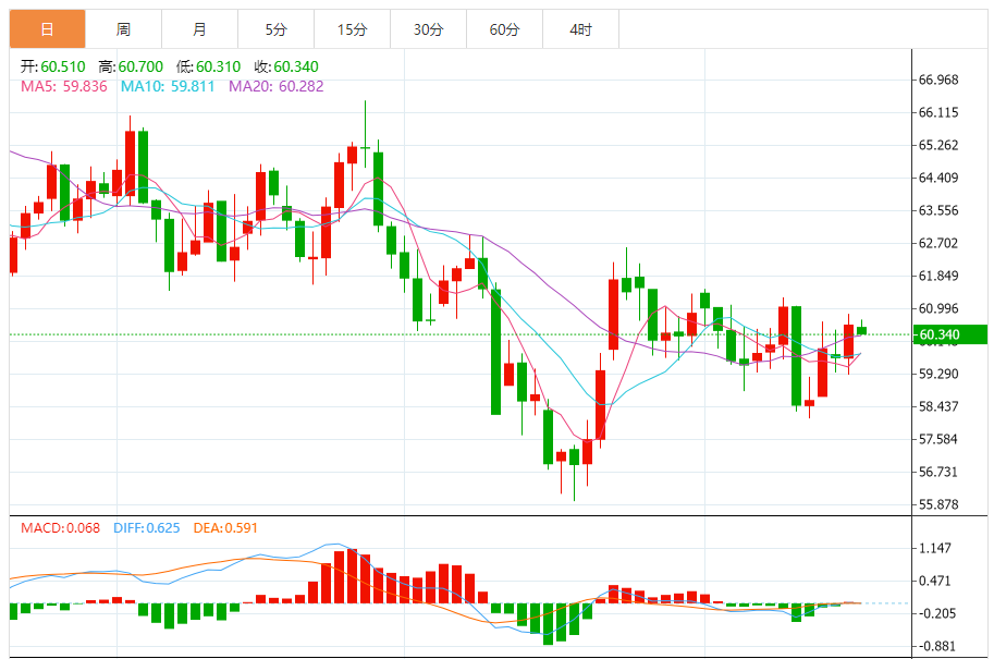 基本消息面 截至2025年11月19日开盘,国际原油市场呈现分化微涨态势,不同标杆品种走势略有差异。其中WTI原油报60.55美元/桶,较前一交易日微跌0.02美元,跌幅仅0.03%,基本持平;布伦特原油表现稍强,报价64.82美元/桶,上涨0.79美元,涨幅达1.23%。现货市场方面,阿曼与迪拜原油价格均为71.62美元/桶