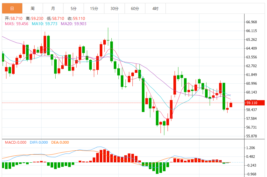 基本消息面 原油价格周四小幅上涨,从前一日的暴跌中略有反弹,交易员在权衡供应过剩创纪录的前景以及美国制裁带来的供应风险。WTI原油期货价格上涨约0.3%,收于每桶59美元下方;此前周三下跌近4.2%,创下6月以来最大单日跌幅。12月交割的WTI原油期货上涨0.34%,结算价为每桶58.69美元,1月布伦特原油上