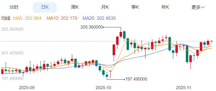 周四,英镑/日元下跌0.02%至203.26附近。 英镑方面,英国国家统计局于11月13日公布第三季度GD等核心数据,市场普遍预期第三季度英国经济环比增长0.2%,低于上一季度的0.3%。若GD数据符合甚至低于预期,将进一步强化英国经济疲软的判断,可能加剧英镑的下行压力;若数据超预期向好,或能短暂提振英镑走
