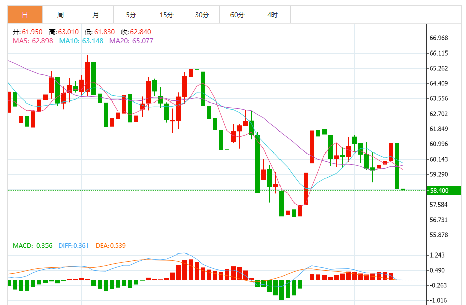 基本消息面 周四,原油价格延续前一交易日的跌势,市场忧虑全球已陷入供过于求的状态。在亚洲早盘交易中,西德克萨斯中质油徘徊在每桶58美元附近,前一夜跌幅超过4%;布伦特原油收于62.71美元,下跌3.8%。 相关新闻消息 投资者普遍认为,供需失衡正在重新主导油市走势。OC