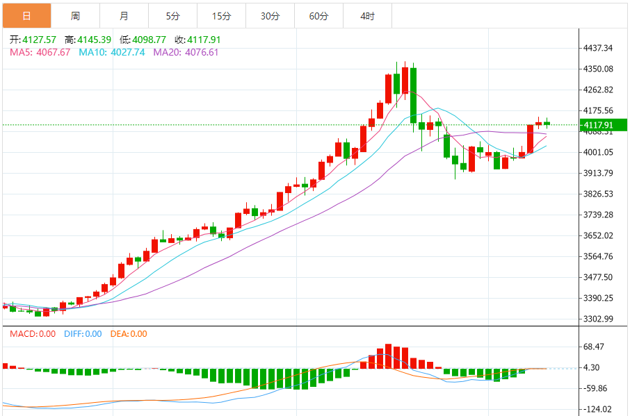 黄金:回调测试支撑,空头动能待释放 当日黄金呈现“高开低走”的弱势格局,伦敦金现从开盘4142.1美元持续回落,午后触及4098.69美元低位后略有反弹,整体处于前期上涨波段的回调过程中,技术面呈现明确的短期调整信号。 1.多周期技术信号 日线级别:价格跌破5日均线(4128美