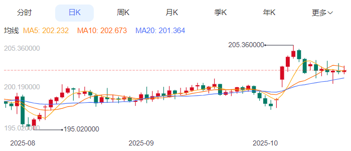 周二,英镑/日元上涨0.09%至202.27附近。 英镑方面,尽管经济增速放缓,但通胀率仍高于2%目标,英国央行首席经济学家ill暗示暂不考虑降息,高息优势显著,类似黄金“美联储降息预期支撑估值”的逻辑。 日元方面,据知情人士透露,尽管日本经济在实现其物价目标方面正在取得进展,日本央行
