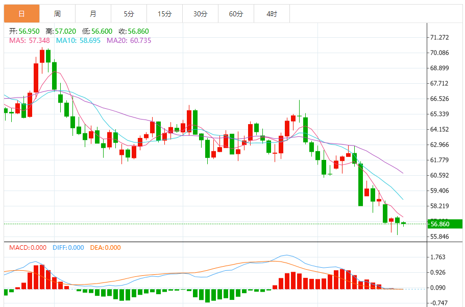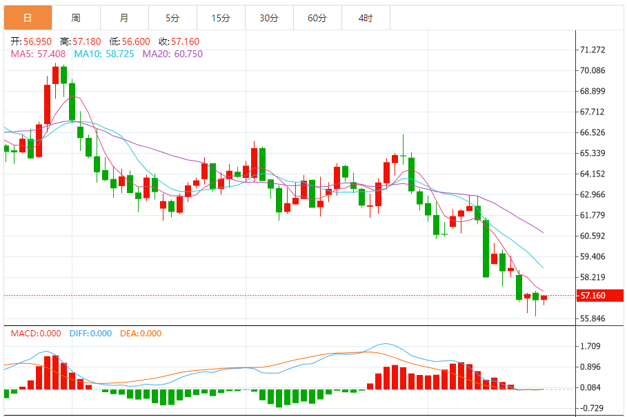 周二(10月21日),美原油价格交投于57.140美元/桶附近,涨幅为0.23%。 原油价格在最近的盘中交易中下跌,准备突破56.35美元的关键支撑位,这是由于其交易价格低于A50所带来的持续动态压力,以及短期内主要看跌趋势的主导地位,显示买入力度疲弱和负面趋势可能继续。 同时,相对强弱指标
