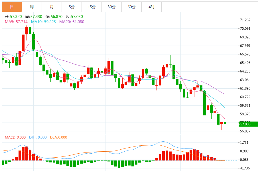 国际油价创五个月新低后小幅反弹 截至10月18日收盘,WTI原油期货收涨0.14%,报57.54美元/桶,但本周累计下跌1.73%;布伦特原油期货收涨0.38%,报61.29美元/桶,本周累计下跌1.3%。10月17日,WTI原油期货收跌1.36%,报57.46美元/桶,布伦特原油期货收跌1.37%,报61.06美元/桶,创五个月新低。油价近期的