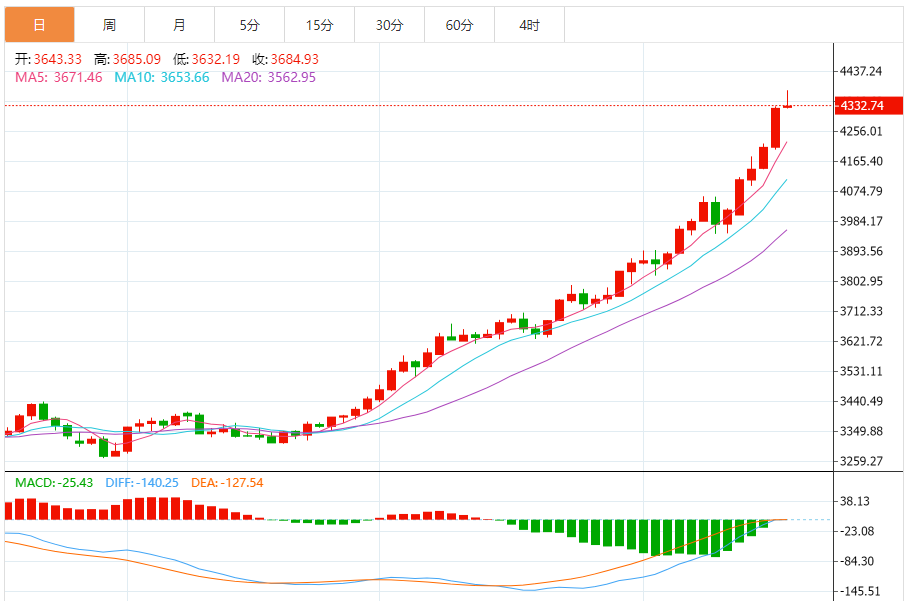基本消息面 周四(10月16日)纽约尾盘,现货黄金涨2.72%,刷新历史高位至4322.04美元/盎司,全天持续震荡上行。COX黄金期货涨3.05%,报4329.80美元/盎司,北京时间04:11涨至4336.70美元,创(盘中)历史新高。 相关新闻消息 特朗普与普京长谈两小时双方同意在布达佩斯再度