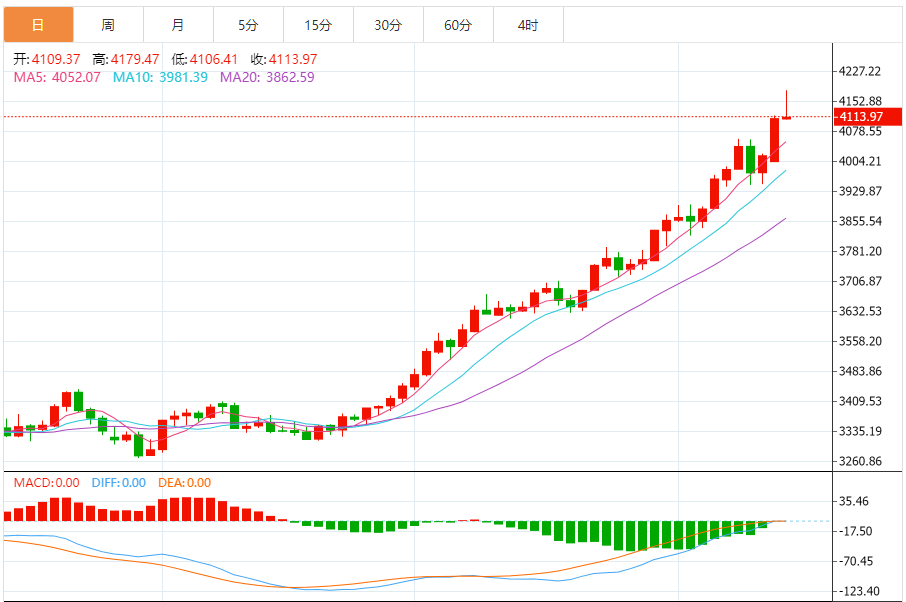 黄金:高位回调压力显现,多头趋势未改 (一)技术形态与趋势判断 日线级别:呈现“冲高回落”形态,昨日以长上影线阳线收于4127.47美元,今日跌破5日均线(4125美元),显示短期多头动能衰减。但周线级别仍维持8连阳格局,布林带上轨持续向上发散,长期多头趋势未被破坏。