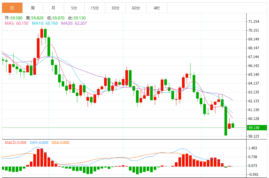 周二(10月14日),美原油价格交投于59.130美元/桶附近,跌幅为0.59%。 原油价格在最近一次盘中交易中小幅上涨,进行有限的修正性反弹以挽回之前的一些损失,但由于仍低于50日指数移动平均线(A50)且在短期内主要看跌趋势的支配下,仍面临较强的下行压力,其价格走势沿趋势线波动,确认了这一趋势。