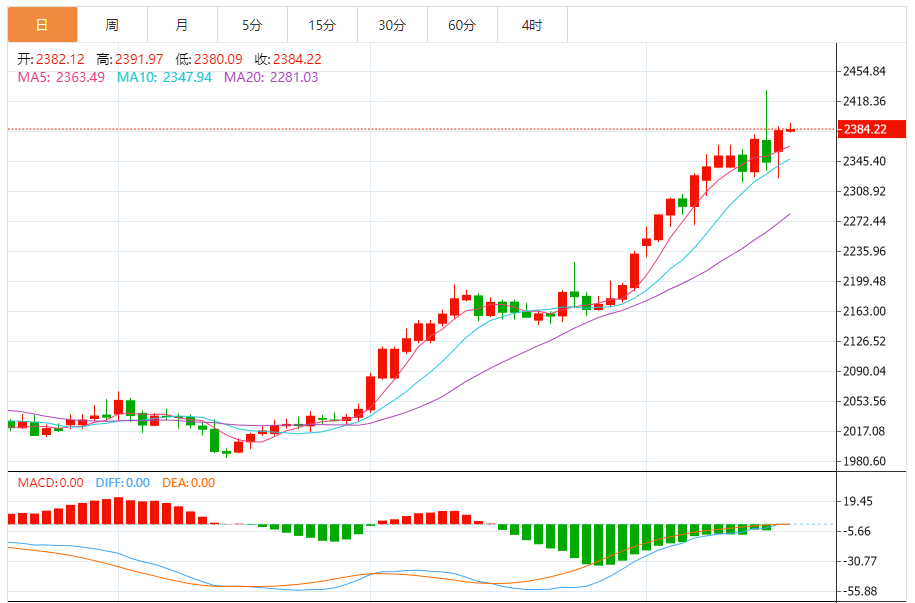 基本消息面 周一(4月15日),尽管美元和美国国债收益率因3月份美国零售销售增幅高于预期而上涨,但由于中东紧张局势刺激避险需求,同时,市场预期美联储今年可能会推迟降息,金价并没有延续上周末的跌势,而是继续攀升。 现货黄金收涨1.66%,收报2382.51美元/盎司。COX黄金期货收涨1.06