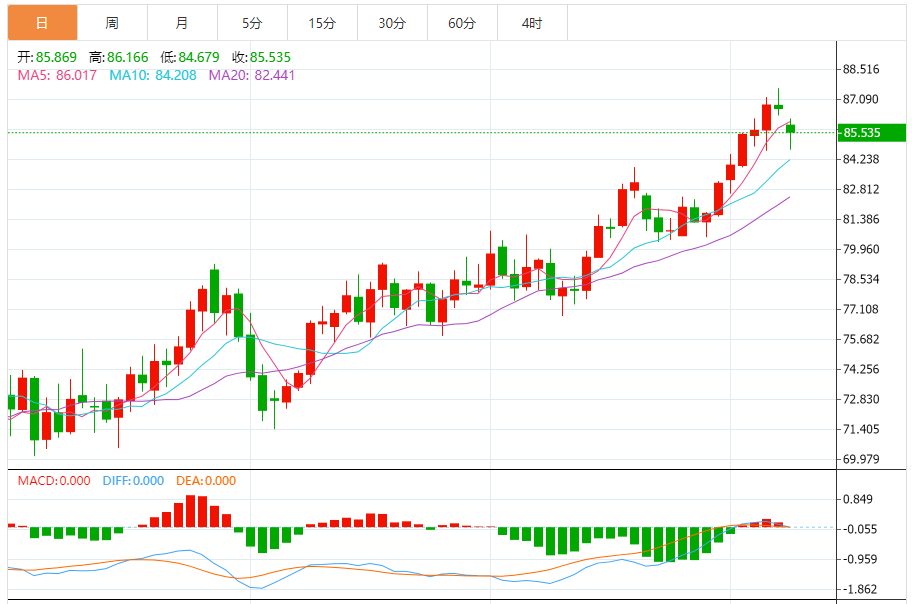基本消息面 周二(4月9日),国际油价窄幅震荡,美原油主力合约目前交投于86.70美元/桶附近。油价周一震荡下跌,结束了连续多个交易日的涨势,之前以色列减少在加沙南部的驻军并与哈马斯开始新一轮停火谈判,盘中最大跌幅一度超过2%,但欧美时段后跌幅大幅收窄,因为停火谈判陷入僵局,令供给紧张的担忧