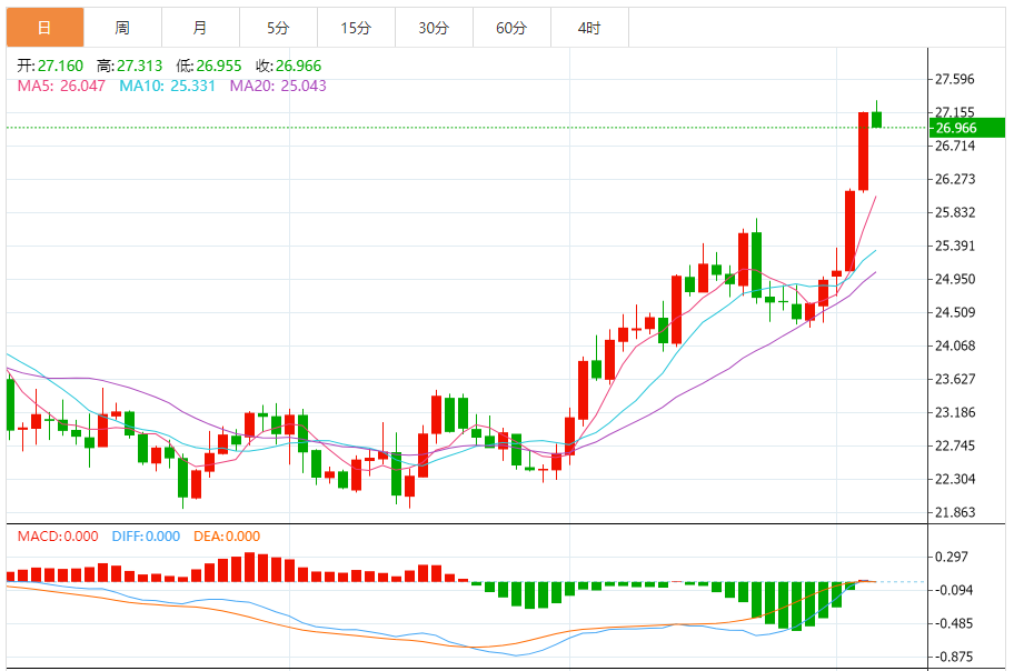 周四(4月4日),现货白银目前位于26.963美元/盎司,跌幅为0.71%。白银价格突破27.00美元关口,昨日收于27.00美元上方,强化了市场对白银在日内和短期继续看涨的预期。 下一个正值预计在28.00美元。 随机指标目前的负值可能会导致暂时的横向波动,然后继续建议的上涨。 突破2