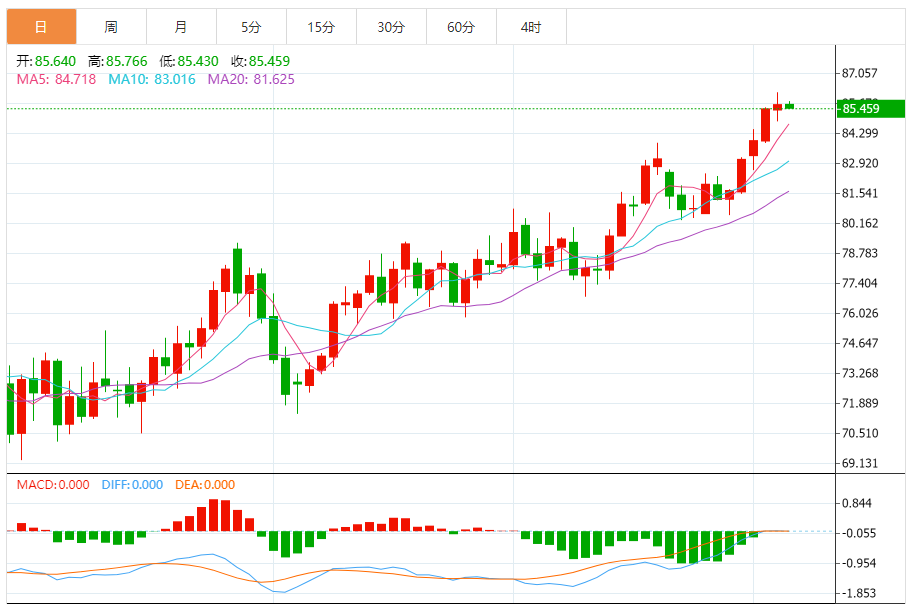 基本消息面 北京时间5日凌晨,美国WTI原油周四收高。本周油价上涨超过3%,并创10月以来的最高水平。 纽约商品交易所5月交割的西德州中质原油(WTI)期货价格收涨1.16美元,涨幅为1.36%,每桶收于86.59美元。 5月汽油期货收报2.7942每加仑美元,5月取暖油期货收报每加仑2.7413