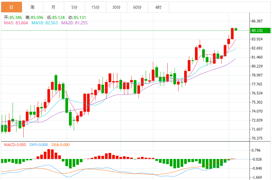 基本消息面 北京时间3日凌晨,美国WTI原油周二突破85美元并创10月以来新高。投资者密切关注中东冲突升级、乌克兰无人机袭击俄罗斯一家大型炼油厂等事件对原油供应的威胁。 纽约商品交易所5月交割的西德克萨斯中质原油(WTI)合约上涨1.44美元,涨幅为1.72%,收于每桶85.15美元。