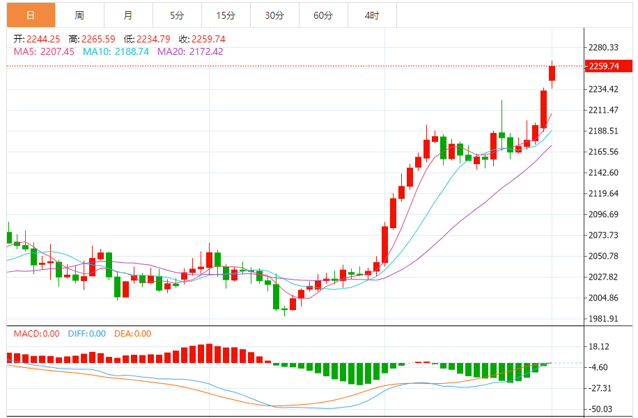 基本消息面 周一(4月1日),现货黄金维持日内强劲走势,金价目前已经站上2260美元/盎司,日内大涨近30美元。金价已经突破新的目标价位2250.00美元/盎司,这为金价进一步大涨铺平道路。 相关新闻消息 金价周一亚市盘中最高触及2265.69美元/盎司,刷新历史高位。
