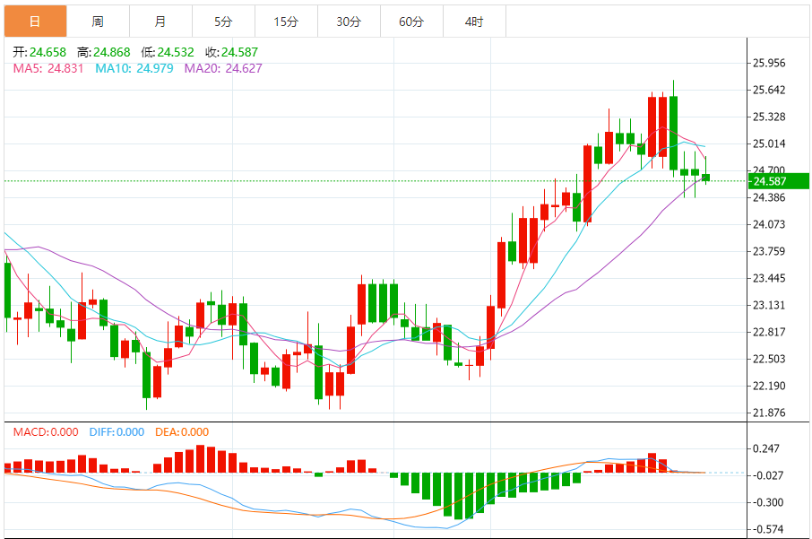 周一(3月25日),现货白银目前位于24.588美元/盎司,跌幅为0.25%。白银价格试图突破24.60美元的水平,但它保持稳定在此之上,以保持看涨趋势在即将到来的时期活跃,等待获得积极的动机,帮助推动价格达到我们等待的第一个目标25.50美元。 突破24.90美元将使上涨变得容易,突破目标水平将使牛市延长至26