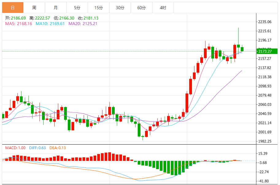 基本消息面 现货黄金上周企稳回升,并一度创造历史新高,上周开于2156.01美元/盎司,最高触及2222.92美元/盎司,最低触及2146.16美元/盎司,最终收于2165.31美元/盎司。美联储货币政策会议结束后,由于保留了年内降息三次的预期,这令美元承受压力,但帮助金价上涨至每盎司2220美元以上的历史新高。