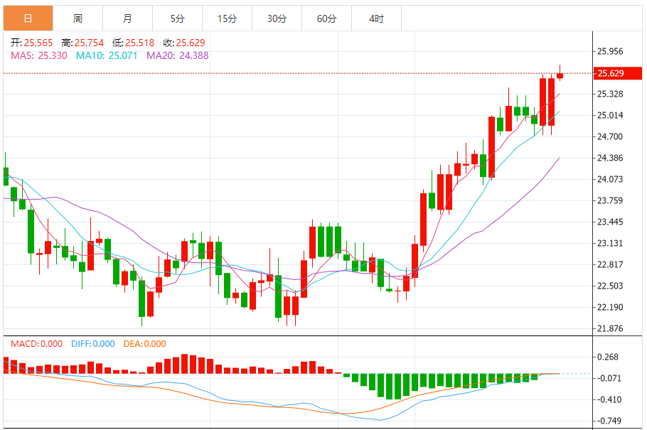 周四(3月21日),现货白银目前位于25.629美元/盎司,涨幅为0.29%。白银价格成功实现了我们等待的25.50美元的目标,今天开盘时进一步上涨超过这一水平,并确认了看涨趋势的延续,为下一站26.07美元开辟了道路。 因此,我们将继续建议未来一段时间的看涨趋势,突破最后一个水平将导致价格实现达到26.90美