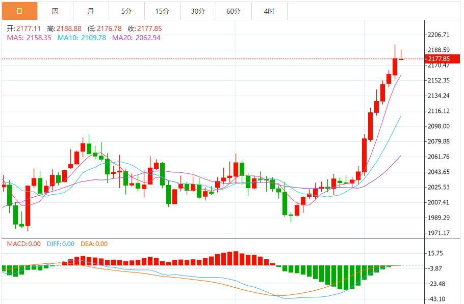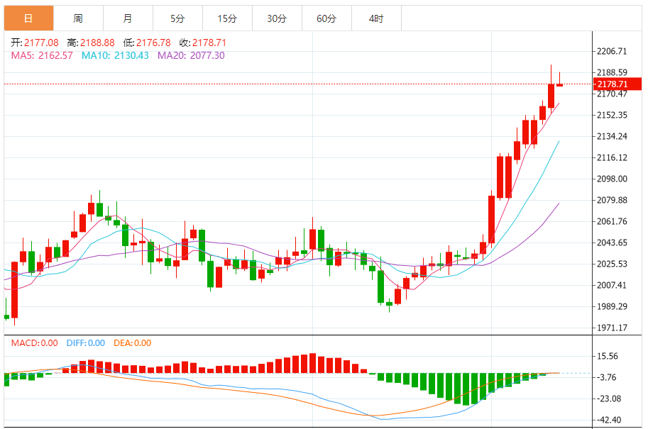 基本消息面 纽约黄金价格周一走高,并接近上周创造的历史最高水平。交易商正在等待本周公布的重要CI与I通胀数据,以判断美联储未来的降息路径。 纽约商品交易所黄金期货市场交投最活跃的4月黄金期价11日上涨3.1美元,收于每盎司2188.6美元,涨幅为0.14%。 5月交割的白银期