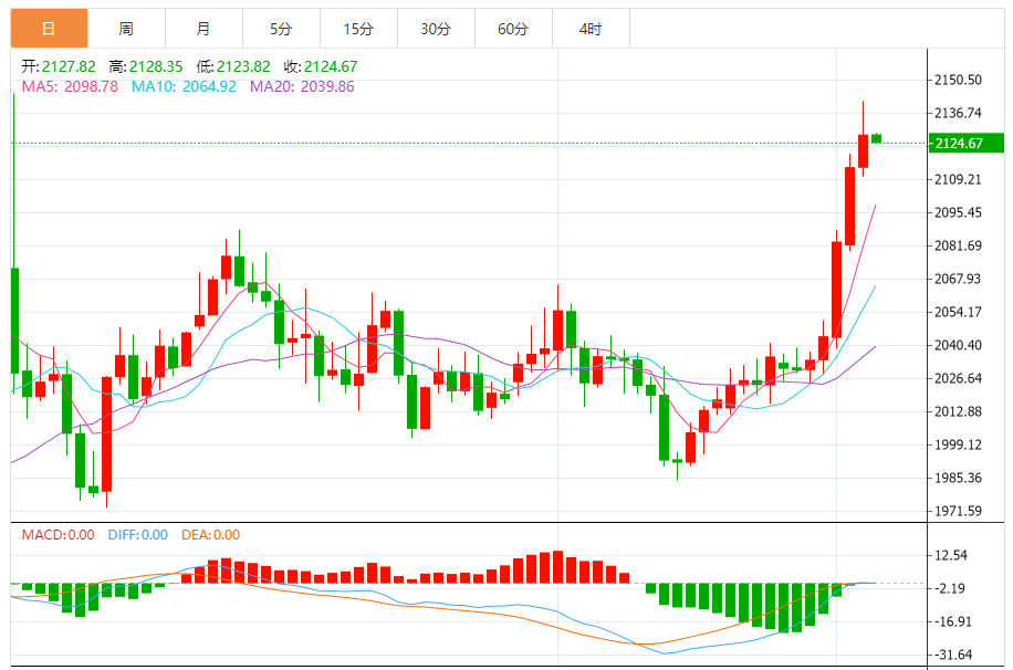 基本消息面 北京时间6日凌晨,周二纽约黄金期货价格突破2100美元,创历史新高。市场对美联储6月降息的预期不断升温,同时中东地区的紧张局势也为金价提供了避险需求的支撑,推动黄金价格强势攀升。 纽约商品交易所4月交割的黄金期货价格上涨0.7%,收于每盎司2141.9美元,突破2100美元的重