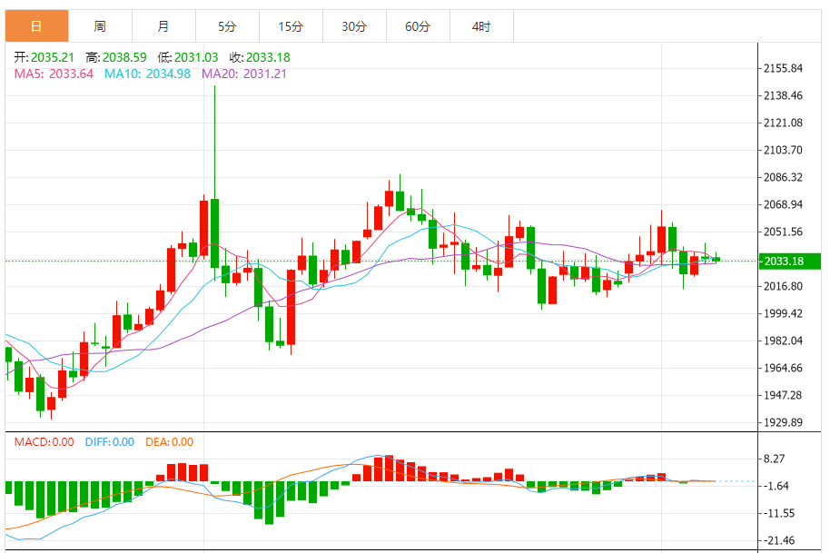 基本消息面 周四(2月8日)欧盘时段,现货黄金价格冲高受阻,盘中最高触及2038美元,现回落至2031美元,跌幅0.19%。 相关新闻消息 周三和周四,黄金价格低迷,在2033美元的50天均线附近盘整,或许是为了寻找新的市场催化剂。持续的盘整阶段不太可能结束,除非价格明确突破206