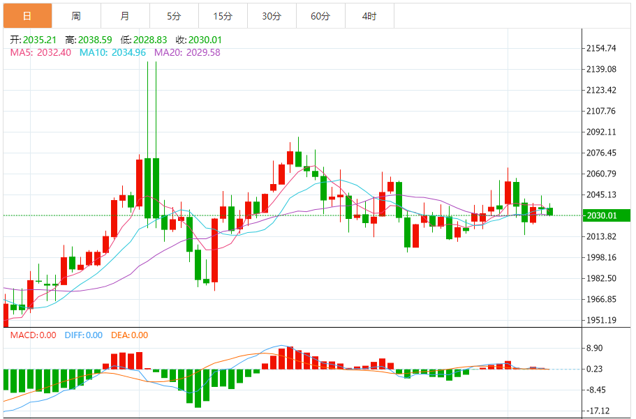 基本消息面 北京时间9日凌晨,周四美国黄金价格走低。随着美联储提前降息的希望减弱,美元和债券收益率上升令金价受到打击。而钯金则因长期需求前景黯淡而延续跌势。 截止发稿,现货黄金价格下跌0.1%,报每盎司2031.69美元。纽约商品交易所的主力黄金期货价格下跌0.2%,报每盎司2046.9美元