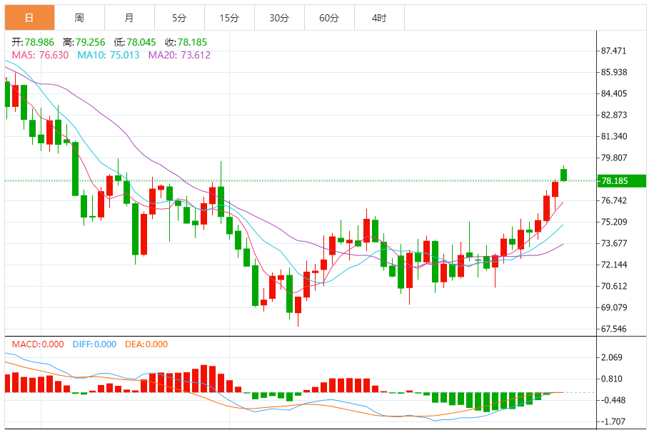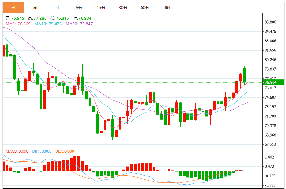 基本消息面 周一(1月29日),WTI原油价格在亚盘早盘延续上周五上涨走势,WTI原油盘中超过79美元每桶,布伦特原油盘亚盘时段三次测试83美元。欧盘早盘,原油价格迅速转跌。截至发稿,美原油连续报77.75美元每桶,跌幅0.40%。布伦特原油连续现报82.71美元每桶,跌幅0.29%。 相关新闻消息