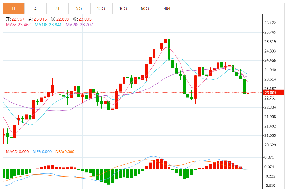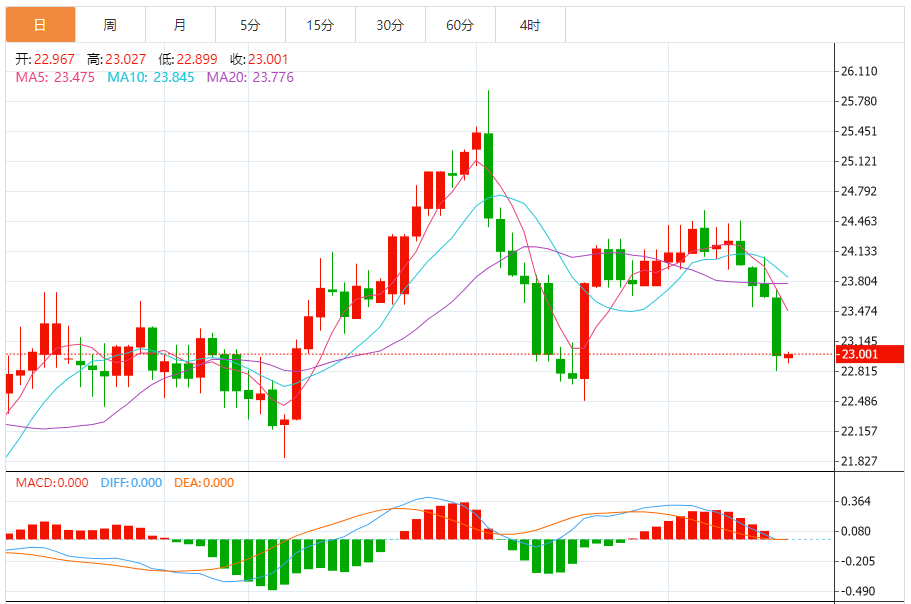 基本消息面 周四(1月4日),现货白银在昨日大跌后暂时企稳,银价目前位于23.00美元/盎司关口附近。银价已经成功触及看空目标23.00美元/盎司,受看空技术面影响,银价后市可能还有进一步大跌的空间。 相关新闻消息 受美元走强打压,现货白银周三收市大跌2.89%,报22.97美元/