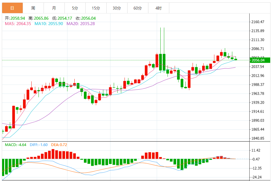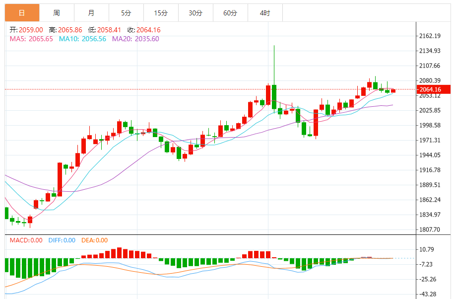 基本消息面 周三(1月3日),现货黄金维持日内反弹走势,金价目前位于2064美元/盎司附近。一旦有效攻克重要水平2065.70美元/盎司,金价前景将转为看涨。 相关新闻消息 受美元走强打压,现货黄金周二上演“高台跳水”行情。现货黄金自接近2080美元/盎司水平大幅回落,收报2058