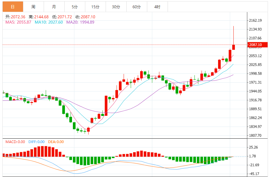 基本消息面 周一(12月4日),现货黄金目前交投在2086美元/盎司附近,亚市早盘金价一度飙升至历史高位。金价已经达成看涨目标2075.25美元/盎司,只要守在这一关键支撑上方,金价后市可能仍有大涨空间。 相关新闻消息 金价开始今日交易后强势上升,突破我们预期的目标价位2075