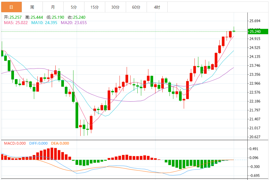 周五(12月1日),现货白银目前位于25.237美元/盎司,跌幅为0.04%。白银价格在今天的交易中以额外的利好开盘,达到了25.50的等待目标阈值,得到了A50的持续支持,这支持了超越这一水平的机会,为实现达到26.07的额外目标开辟了道路。 因此,看涨趋势将在未来一段时间内保持有效,并注意到未能突破25.5