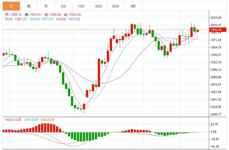 基本消息面 北京时间23日凌晨,纽约黄金期货价格周三跌破每盎司2000美元的关键水平。美元从低点反弹以及美国国债收益率收复失地令金价承压,但对美联储将暂停加息的预期限制了金价的下滑。 纽约商品交易所12月交割的黄金期货价格下跌0.4%,收于每盎司1991.30美元。周二该期货收在每盎司200