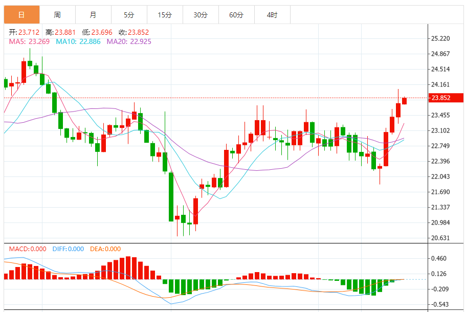 基本消息面 周五(11月17日)欧市早盘,现货白银维持日内升势,银价现报23.85美元/盎司附近。银价已经突破目标价位23.70美元/盎司,这为银价进一步走高铺平道路。 相关新闻消息 现货白银周四收市攀升1.32%,报23.74美元/盎司。 银价昨日突破我们等待的目标23.70