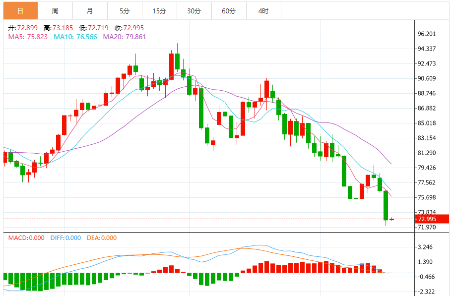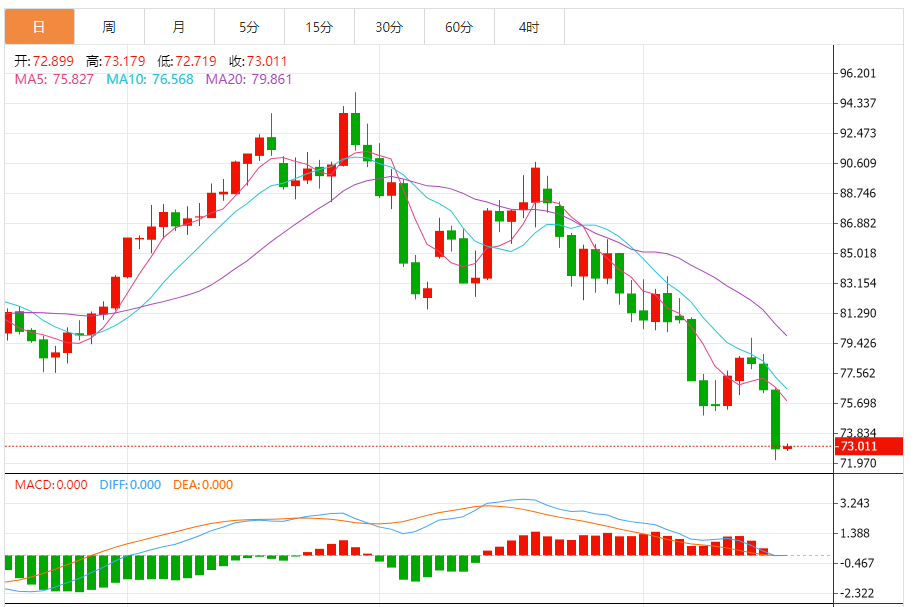 基本消息面 周五(16日),油价于四个月低位附近徘徊,昨日暴跌4.7%,本周周线可能大幅下跌,供应增加以及全球需求恶化点燃了投资者担忧情绪。连串的负面消息拖累原油价格连续四周下跌。截至发稿,美国WTI原油期货价格升7美分或0.10,报72.97美元/桶,昨日跌4.7%;布伦特原油期货价格升3美分或0.04%,报