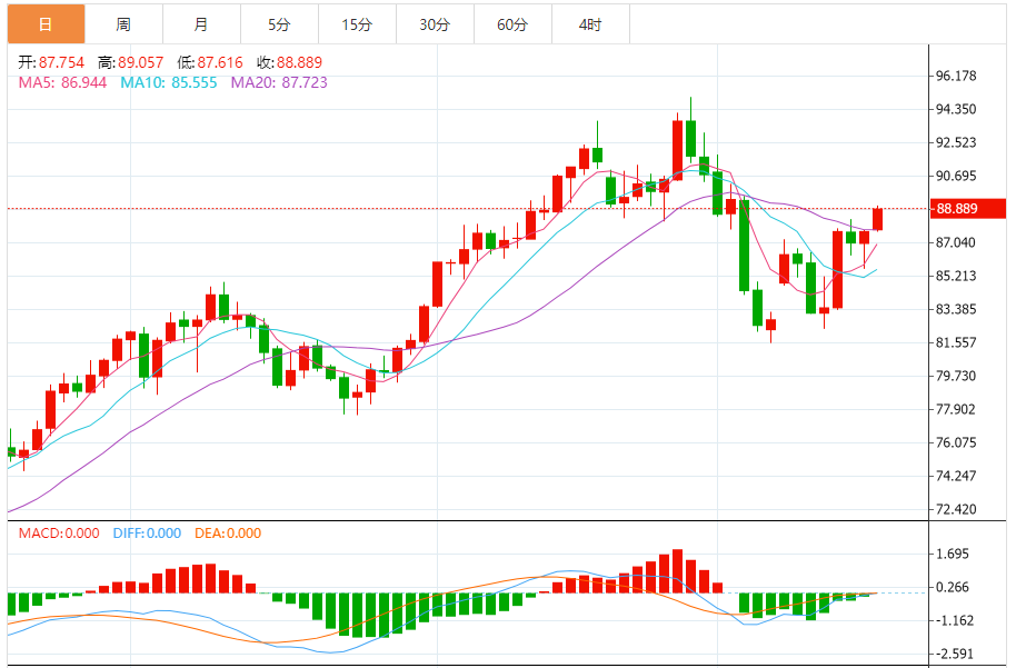 基本消息面 周三(10月18日),美国原油价格报88.88美元/桶。WTI原油市场本周的交易中出现大幅度波动迹象。一些买家很快重返市场,反映出普遍存在的供应担忧和严重的地缘政治紧张局势。这个市场似乎不可避免地会反弹,甚至可能走高。90美元水平是一个重要的心理水平,有可能升至95美元水平。