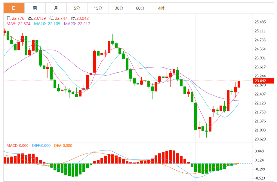 基本消息面 周三(10月18日)欧市早盘,现货白银维持日内升势,银价目前位于23.10美元/盎司附近,日内大涨1.2%。银价已经突破目标价位23.00美元/盎司,这为银价进一步大涨打开空间。 相关新闻消息 银价昨日成功触及我们等待的目标价位23.00美元/盎司。银价开始今日交易后进一