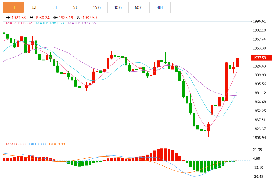 基本消息面 周三(18日),金价大升,逼近一个月高位,因以色列与哈马斯的冲突推升了避险需求。截至发稿,现货黄金价格升13.79美元或约0.72%,报1936.95美元/盎司;黄金期货价格升13.35美元或约0.69%,报1949.05美元/盎司,稍早一度升逾15美元,达1955.35美元。黄金现货和期货皆接近一个月来高位。