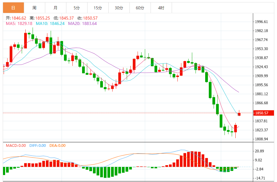 基本消息面 周一(10月9日),现货黄金维持日内强劲升势,金价目前位于1852美元/盎司附近,日内大涨逾20美元。 相关新闻消息 因中东危机引发投资者避险,金价上升1%。金价开盘后一度创下1856美元/盎司的五日新高。中东不断升级的地缘政治紧张局势吓坏市场,投资者在黄金价格