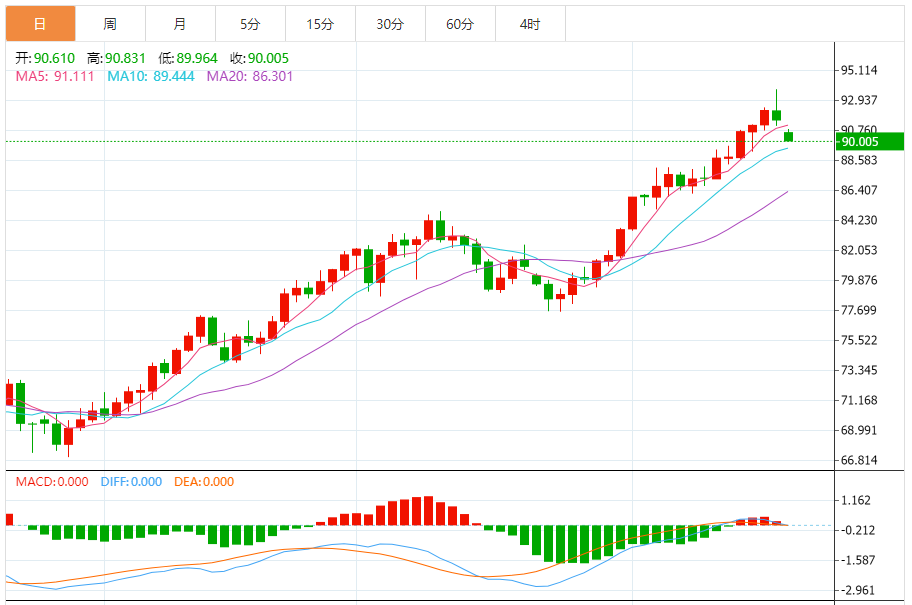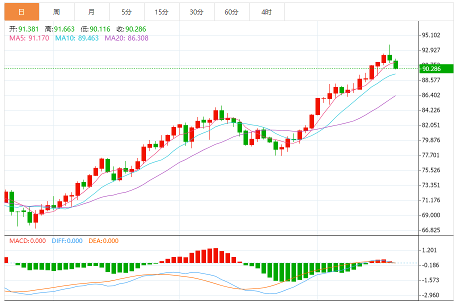 基本消息面 或因投资者获利了结,原油有所回落,WTI原油日内跌超1%,盘中一度跌至90.28美元的日内低点,最终收跌1.66%,报90.67美元/桶;布伦特原油盘中一度站上95美元,为去年11月以来首次,并涨至95.91美元的日高,而后回吐全部涨幅并转跌,最终收跌0.19%,报94.35美元/桶。 相关新闻消
